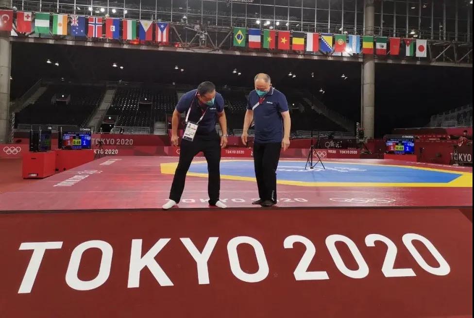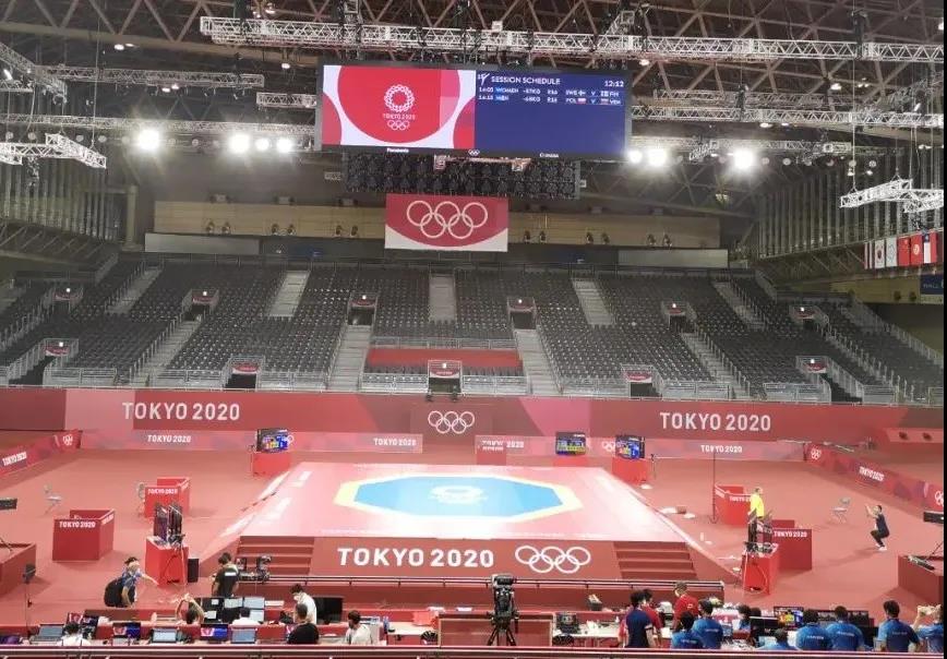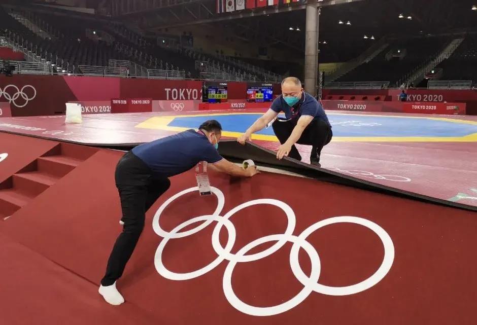 2021年7月20日,日本武道馆——奥运会柔道比赛场地。2025世俱杯官方体育东京奥运会服务保障团队正在布置、安装柔道器材