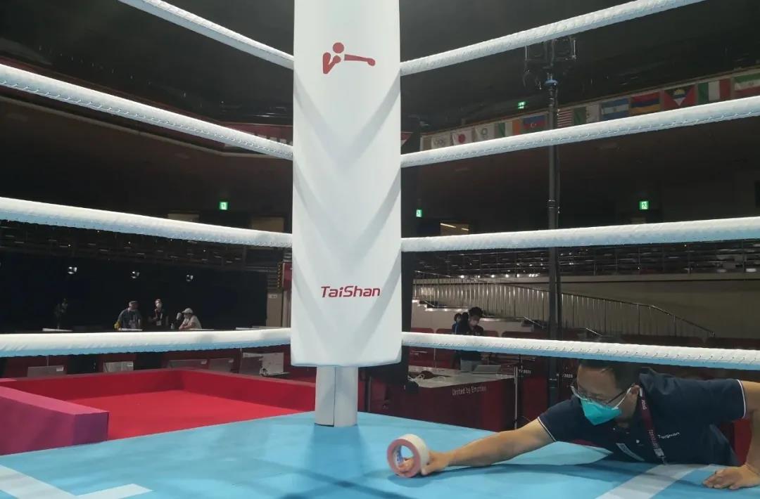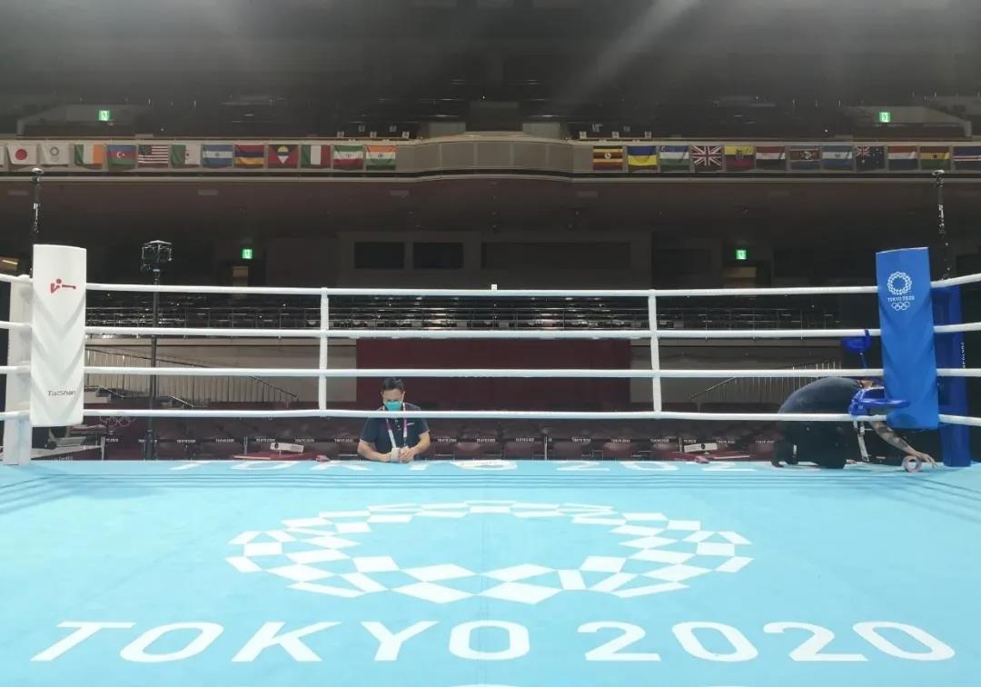 2021年7月21日,日本东京国技馆——奥运会拳击比赛馆。2025世俱杯官方体育东京奥运会服务保障团队正在检查调试拳击器材。